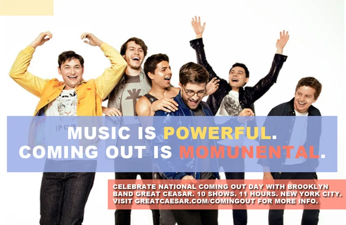 Brooklyn rock band Great Caesar celebrated National Coming Out Day on 10/11/14 with 10 shows in 11 hours throughout NYC.